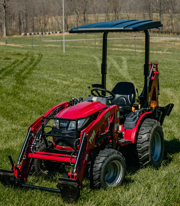 Mounting crossbar and brackets are made of durable steel coated with a thick layer of black powder coat paint to resist rust and scratching. All Eclipse Canopy materials and products are made in the USA. Fully adjustable to level position on forward and rear leaning ROPS.
